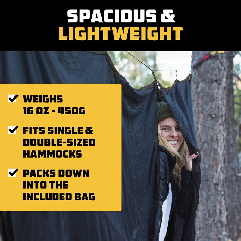 - Simple Setup: Complete with a durable double-sided zipper, our hammock bug net allows you to zip and unzip inside or outside. It also features a 30-foot-long ridge line, so you'll never run out of rope.