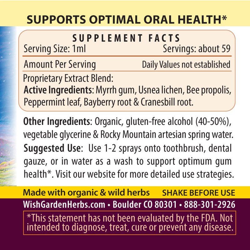 - CLEANSES AND PROMOTES HEALTHY GUMS AND ORAL HEALTH WHICH SUPPORT HEALTHY TEETH: All-natural mouth rinse uses traditional oral health herbs including Myrrh gum, Usnea lichen and Bayberry root bark to support sensitive tissues and healthy inflammatory response while Peppermint leaf leaves your breath smelling fresh. Apply 1-2 sprays of WishGarden's gum health supplement onto tooth brush, dental gauze, or in water as a rinse (similar to oil pulling) to support optimum gum health.