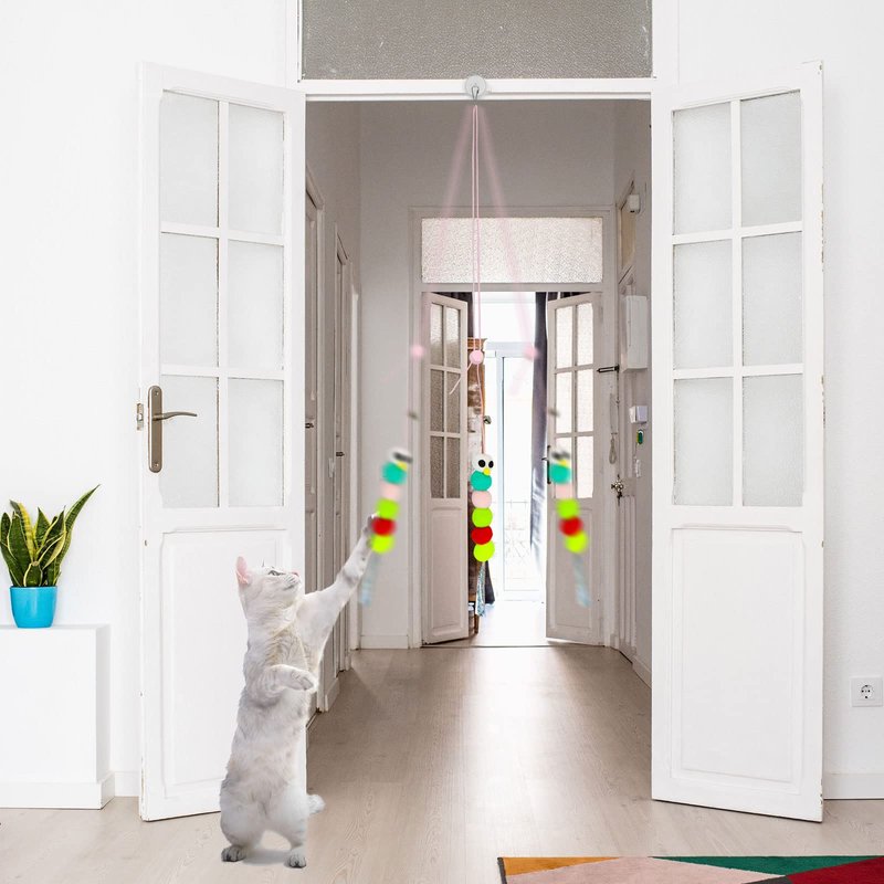 - 3.The cat hanging toy comes with a sticky hook, adjustable buckle and a bungee cord, the length of which can be adjusted to your needs. You can stick the toy on the door frame, wall, table, doorknob or other places and your cat can play by itself, freeing your hands.