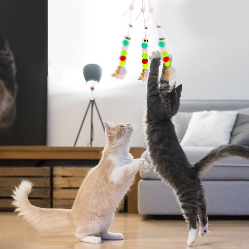 WishLotus Interactive Cat Toys, 2 PCS Retractable Hanging Door Self-Playing Cat Feather Toy, Soft and Cute Caterpillar Cat Toy with String, Sticky Hook and Bell for Cat Playing and Killing Time (A)
