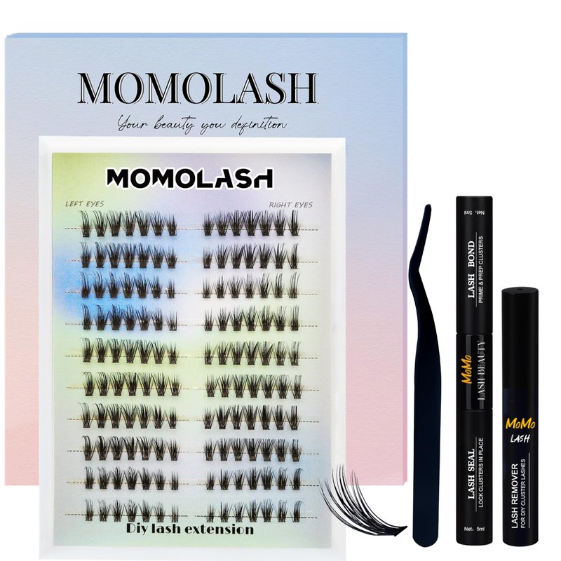 - 【WHAT YOU CAN HAVE】MomoLash fluffy eyelash extension kit offers 140pcs high-quality lash clusters 10-16MM, 10ml lash bond and seal, 5ml remover, eyelash tweezers, offering all you need to diy eyelash extension at home, allowing you to achieve professional results in the comfort of your own home.