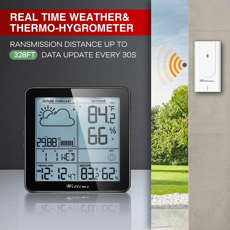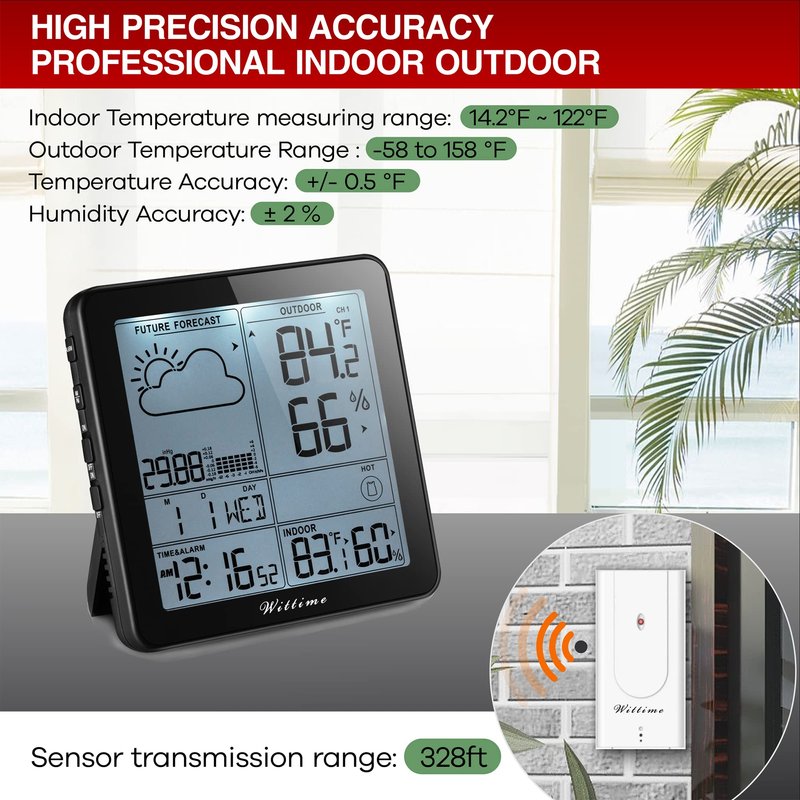 - Indoor Outdoor Thermometer Wireless: Wittime 2180 inside outside thermometer has a clear view from every angle whether you are near or far. The wireless remote sensor takes estimations at 30 Seconds regular interval to stay up with the latest and precise to the moment so you can plan your day as you need.