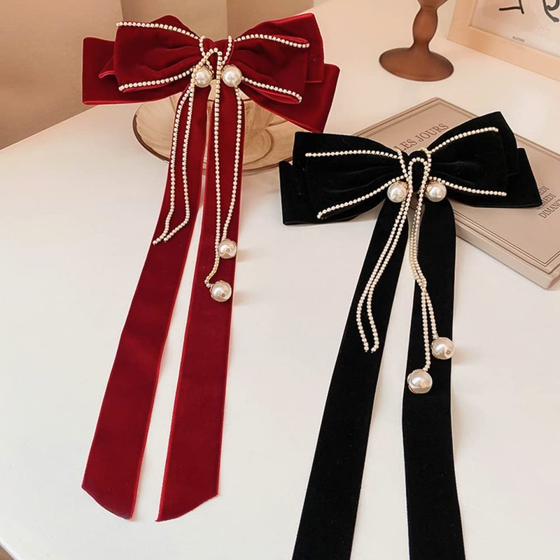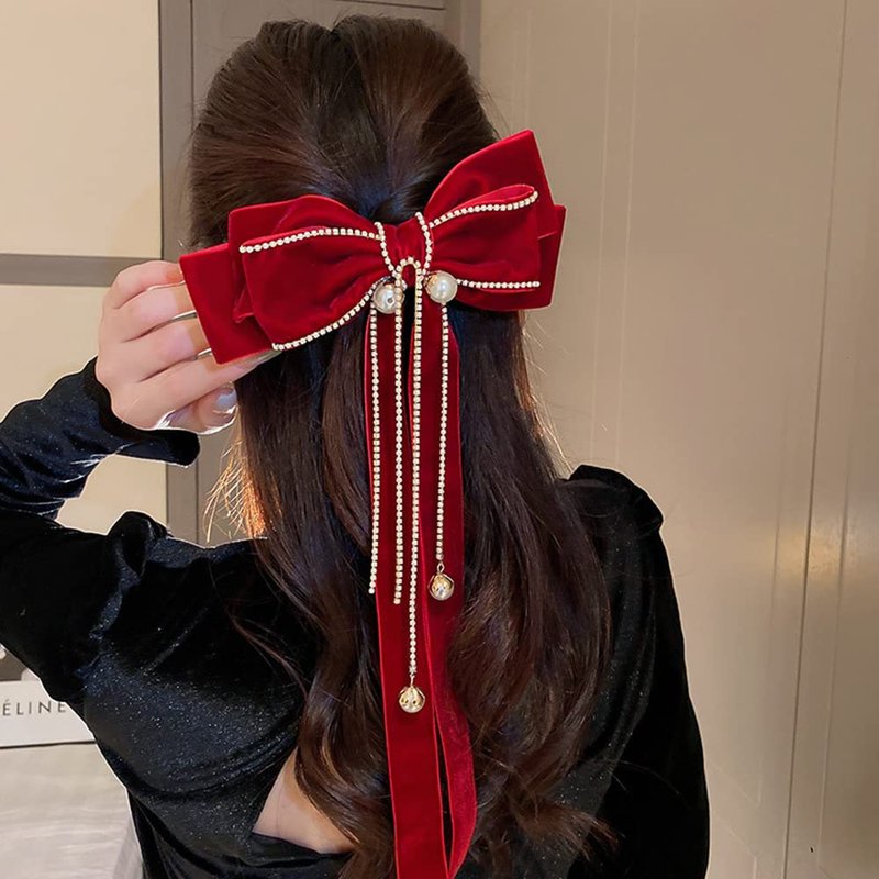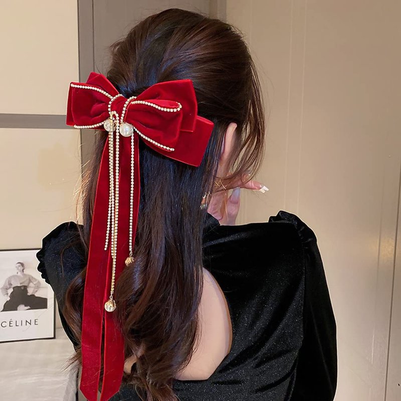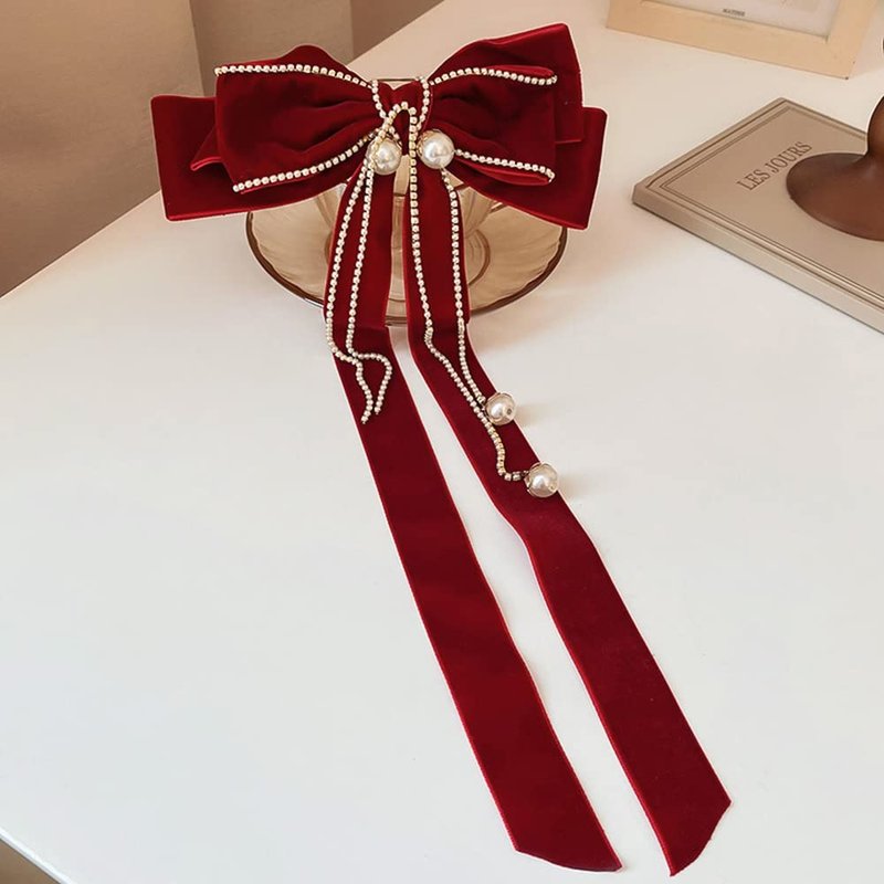 Wiwpar Red Velvet Bow Hair Clips for Women Big Bow Barrettes Pearl Bead Tassel Hair Clips Bowknot with Long Brocade Tassel Ribbon Tail Hair Pins Claw Hair Accessories for Christmas Gift Party (red)