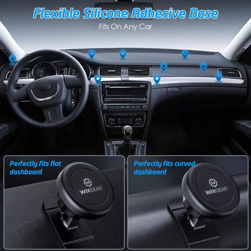 WixGear Universal Stick On Magnetic Phone Mount Holder Black 2 Pack. Setting up your phone on a mount in your car has never been easier! WixGear Air Vent Car Mount for smartphones saves you the hassle of placing your smartphone securely to make sure it doesn't fall, just stick it on your car dashboard! The WixGear Air Vent Mount features magnetic technology, which means your smartphone will be secure and have no chance of falling. When a phone is secure in place, it becomes easier to use for GPS navigation too. Features 1) This magnetic car mount for cell phones is not bulky or space-consuming at all. You no longer have to suffice for keeping your phone in the cup holder or dashboard, because a normal car mount gets in the way. This magnetic car mount sticks on a dashboard, thereby not blocking your windshield or Air Vent. 2) Navigation is extremely easy with this magnetic car mount. It can easily rotate, fix, or tilt to any angle that best assists the viewer of the phone. 3)The magnetic technology is safe to use, and will not harm any smartphone. The carbon steel plates inside the magnetic car mount are ultra thin and designed in a way that it provides powerful holding power as well as absorbing magnetic instability. Along with being safe, it is also powerful, it attracts any phone to it quickly – this is the swift snap feature. The user can just bring the phone near the mount and it will take it easy, so the user no longer has to fuss about safe keeping their phone Instructions how to set up the Mount 1)First clean up the surface on the mounting place. 2)Peel off the sticker from the mount and stick it on. 3)Place the magnet metal plate in your case between the cover and the phone, Or stick on the round magnet metal on your phone or GPS 3) And your phone is good to go!