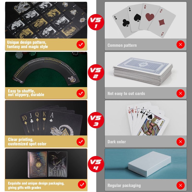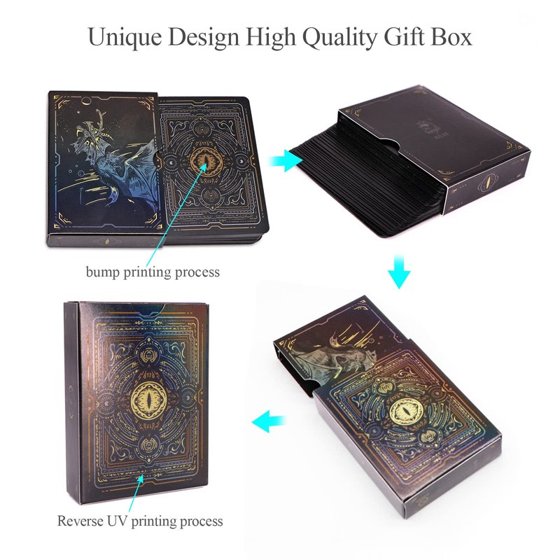 - [Cool Design] New version dragon cards have good artwork and nice quality,they are beautiful and easy to read.Cool black background let the cards become noble and mysterious.Let you have a remarkable experience of the game and entertainment. Good gift for family,friends or boss.