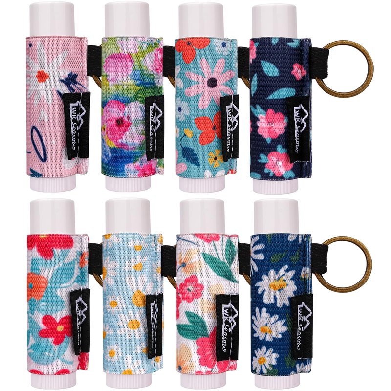 WK IEASON 8PCS Lip Balm Holder Keychain Bulk Chapstick Holder Key chain Lip Gloss Sleeve Holder -Elastic Holder Sleeve for Fat and Slim Lip Balms&Gloss and Lip Sticker(8pcs Floral C)