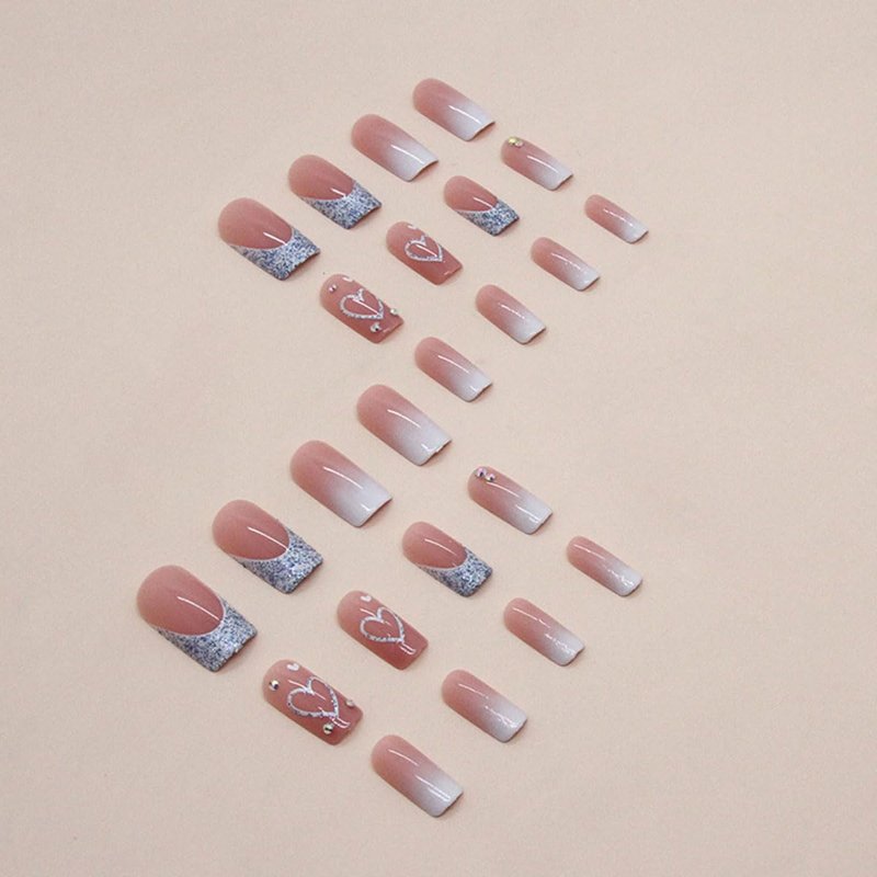 WLGDLH French Press on Nails Medium Square Fake Nails Press Ons White Ombre Medium Coffin False Nails Nail Tips with Flash Love Stick on Nails Artificial Acrylic Nail Kit for Women Nail Art 24PCS