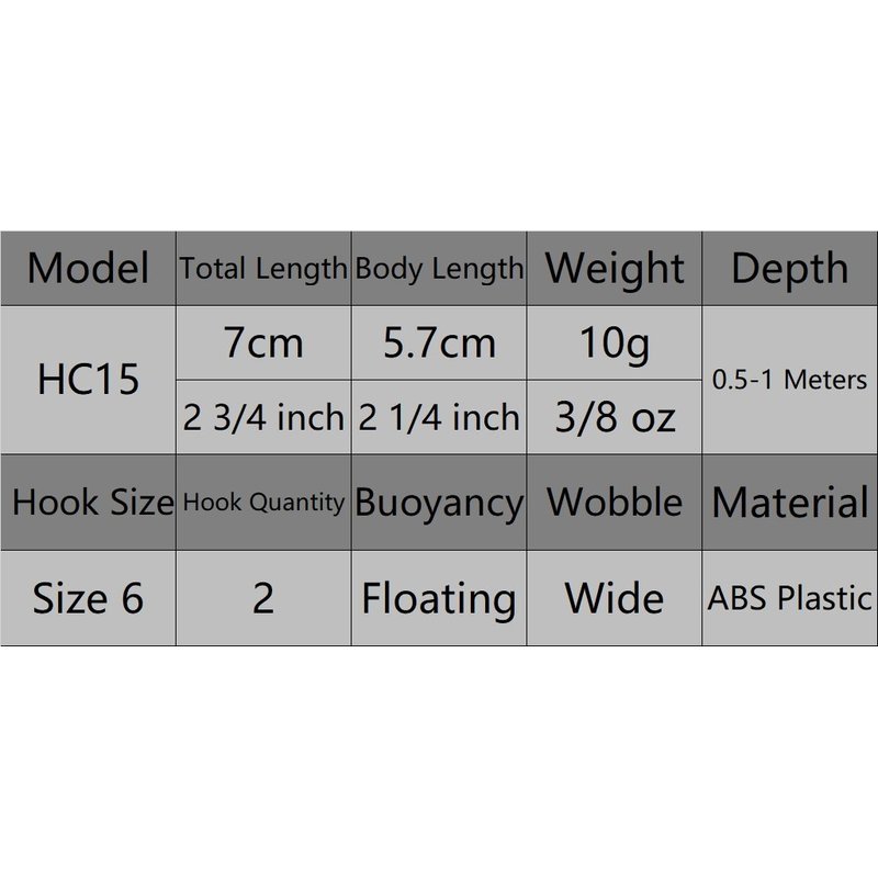 - Length: 2 3/4 inch (7 cm) Body Length: 2 1/4 inch (5.7 cm) Weight: 3/8 oz (10.6 g) Depth: Shallow Hook Size: 6