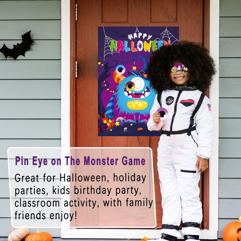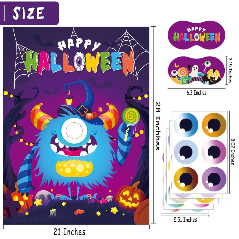 - Complete Halloween Game Set: A large monster game poster, A poster cover, 30 reusable monster eye stickers, 3 comfortable eye mask, and dot stickers. Note: Due to packaging, the poster may have some creases. Flatten before use