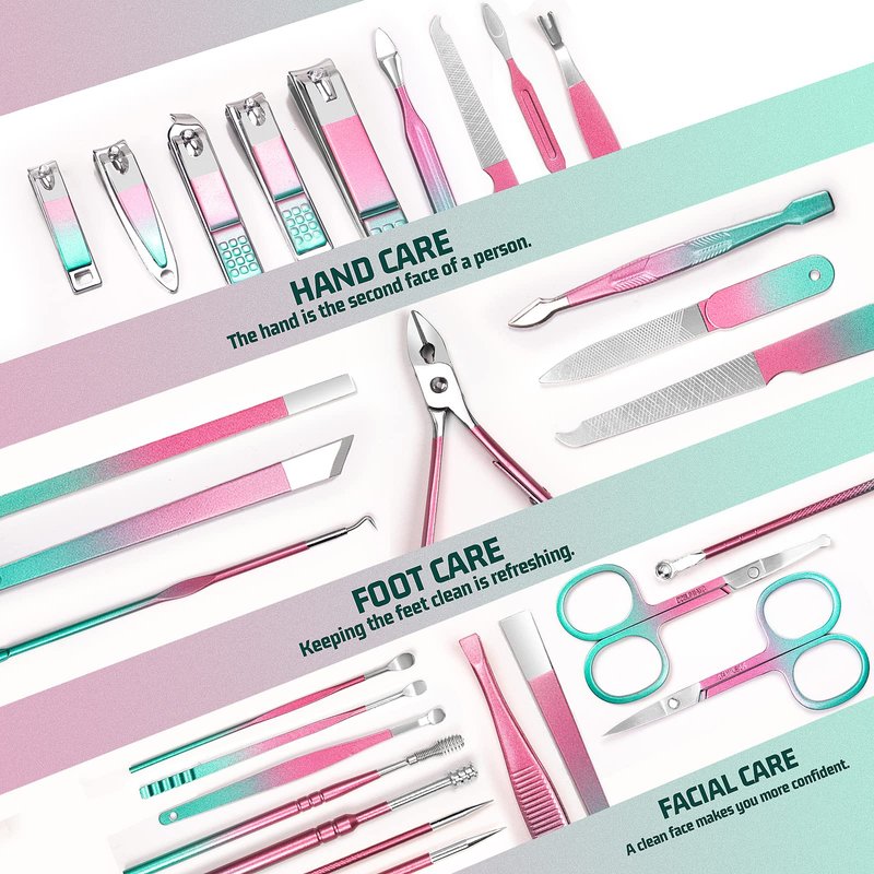 - đ„°ă30 IN 1 UNIQUE MANICURE SETă:The professional manicure kit by WOAMA features a distinctive color gradient of pink and green and includes 30 pieces of nail, facial, and pedicure care tools.