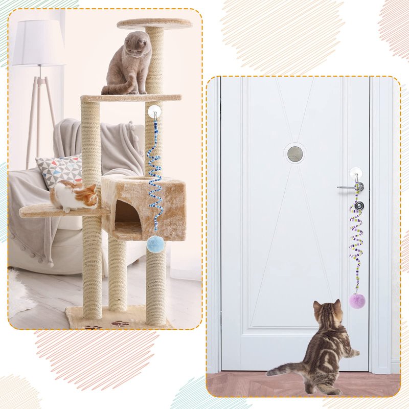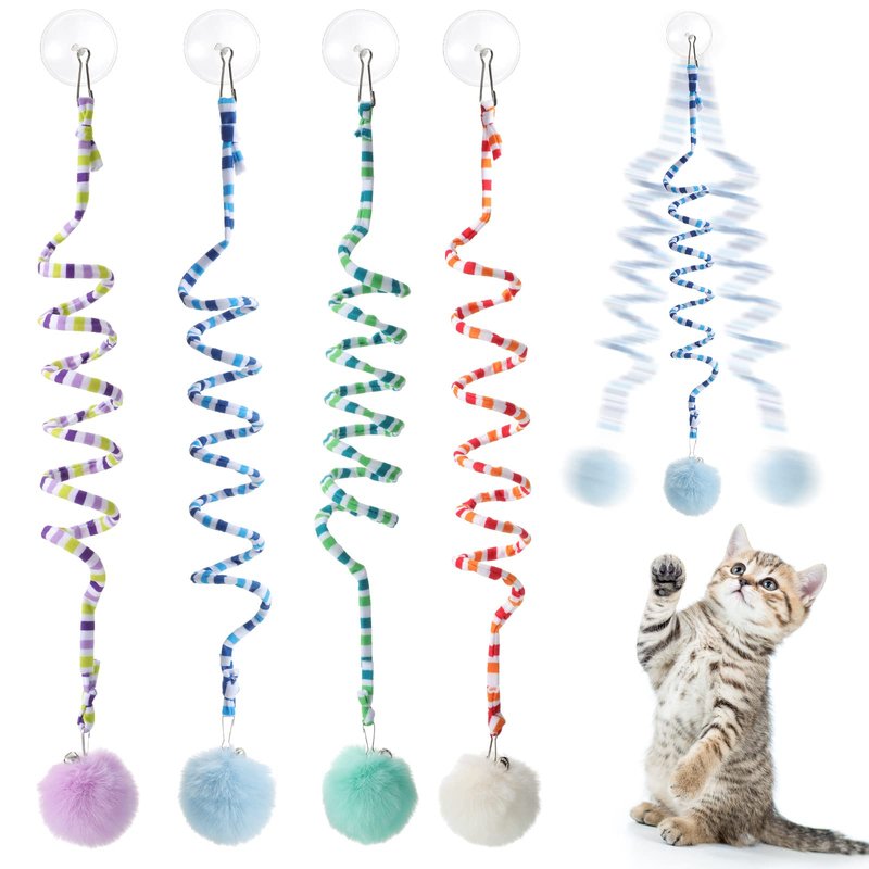 - Door Hanging Cat Toys: our interactive spring cat toy kit comes with 4 pieces of cat toys in green, blue, red and purple; These self play cat toys come with traceless suction cups and detachable connecting clings, you simply hang the toy on a door or wall in a suitable place for the cat to play by itself, providing a lot of fun for your cat while freeing your hands