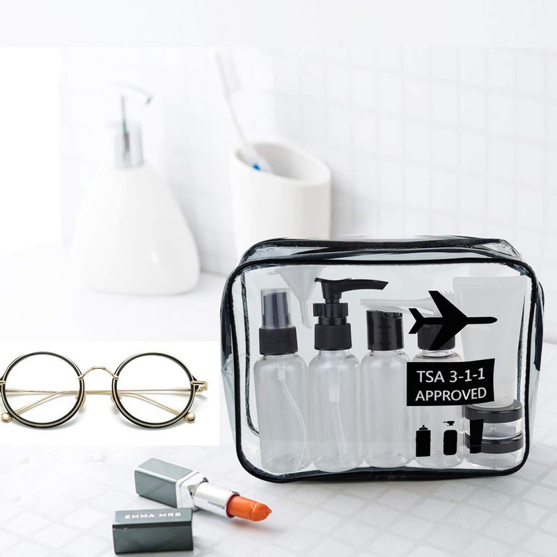 Wobe Travel Bottles and TSA Approved Toiletry Bag Clear Quart Size with Leak-Proof Travel Accessories & Containers for Liquids Carry-On Luggage Compliant for Airplaine High Quality: The toiletry bag is made of TPU material, which is odorless, highly transparent, not easy to grind, soft, foldable and space-saving. Sturdy smooth zipper, large zipper opening and luxurious zipper puller make it easy open and pack. The travel containers / bottles are easy to clean and reusable. Make Your Travel More Easy & Relaxing! There is no greater frustration than arriving at the airport and having to repack your liquids or cosmetic Package Contains: 1 Travel toiletry bag - 7.9*6.3*2.3 inches / 20*16*6cm 1 Pump bottle - 1.8fl.oz / 50ml 1 Spray bottle - 1.8fl.oz / 50ml 1 Soft tube - 1fl.oz / 30ml 2 Squeeze bottles - 1.8fl.oz / 50ml 2 Jars - 0.18oz / 5g 1 Mini spatula 1 Pipette 1 Funnel