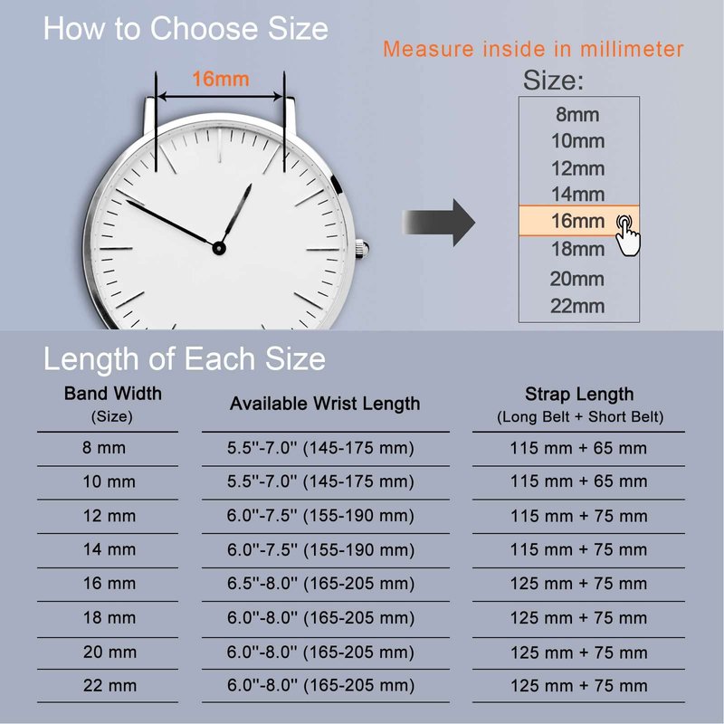 Suitable for most traditional watches and smart watches which lug width is standard 8mm, 10mm, 12mm, 14mm, 16mm, 18mm, 20mm, 22mm. (Not for special design watch lug)