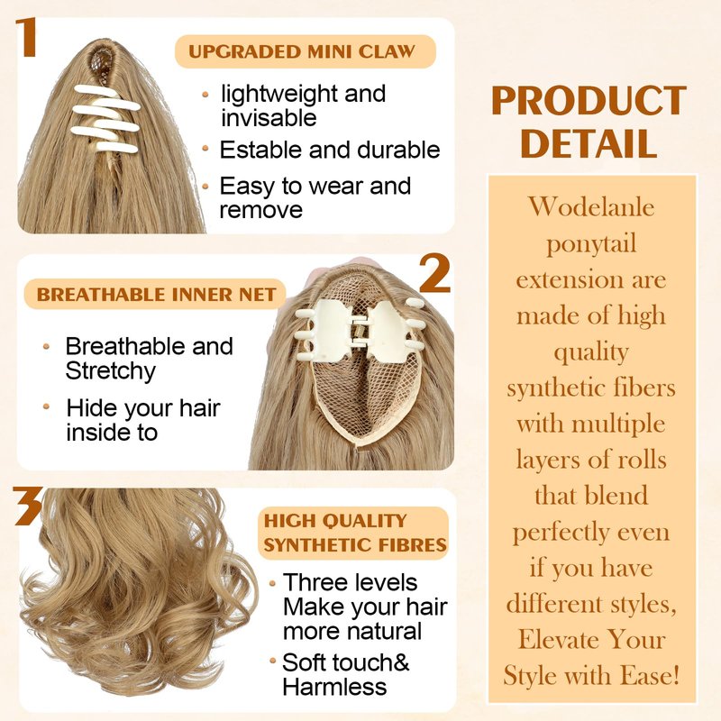 - 💕【Advantages】Wodelanle long ponytail hair extension combines an upgraded claw clip with a comfortable and breathable interior mesh. The excellent design of Ponytail Extension ensures a perfect and secure connection that won't tangles and fall out,,So you can easily have a long ponytail hairstyle!