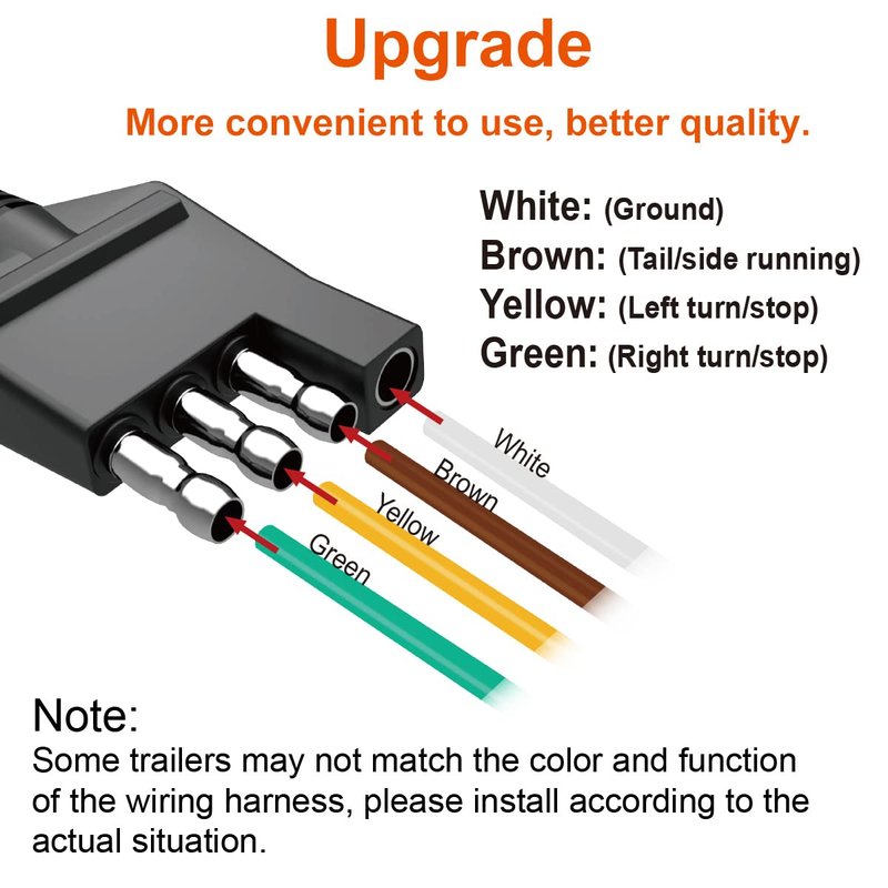 WOFTD 4-Way Trailer Wiring Harness with 5 ft Wires 4-Pin Trailer Wiring Jacketed Cable 4 flat trailer wire Extension Connector - 5 ft The WOFTD 4-way trailer Wiring Harness, the wire is made of 18AWG brass material, The safe temperature is below 105 degrees Celsius and the safe voltage is below 300V. It is wrapped with insulating rubber that will never rust or corrode. This 4-pin trailer wiring plug comes ready to splice into your existing trailer wiring It can be used to connect the taillights, brake lights and turn signals. 4 Way Flat Trailer Wire Harness Connector Socket for Trailer Truck Hitch Wiring. The trailer connector makes a great replacement 4-flat trailer wiring connector The 4-pin wiring design matches industry-standard 4-way flat sockets and can be used on a wide variety of trailers. The 5-ft wire lead provides plenty of extra length for a flexible installation.(The Trailer Wiring Harness perfect adapt WOFTD Trailer Plug Adapter)