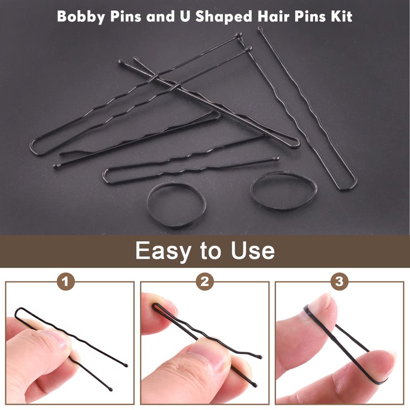 - π₯ What You Get ------ In this kit, You will get 380Pcs 2 Inch Bobby Pins and 2.4 Inch U Shaped Hair Pins with Black Rubber Bands. 2 Styles Hair Pins Bobby Pins and U Shaped Hair Pins, 100Pcs Black Rubber Bands. In total 380Pcs. The right size to pin the hair, enough for your spare and replacement in daily.