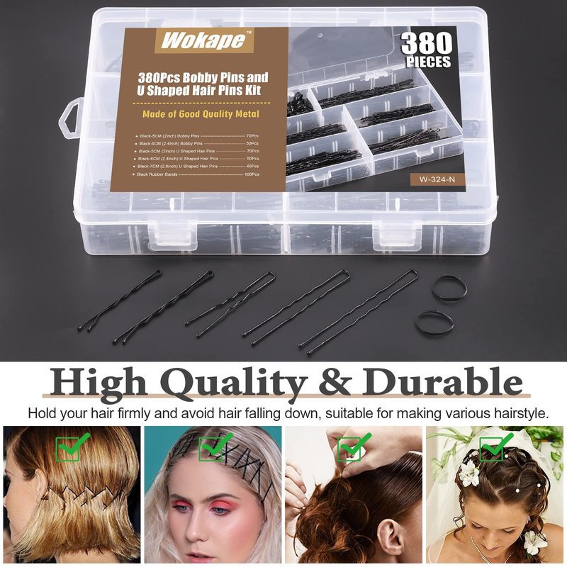 π» Wokape 380Pcs 2 Inch Black Bobby Pins and 2.4 Inch U Shaped Hair Pins with Black Rubber Bands Soft Elastic Bands Assortment Kit , Blonde Hair Pins for Buns Women Girls with Storage Box