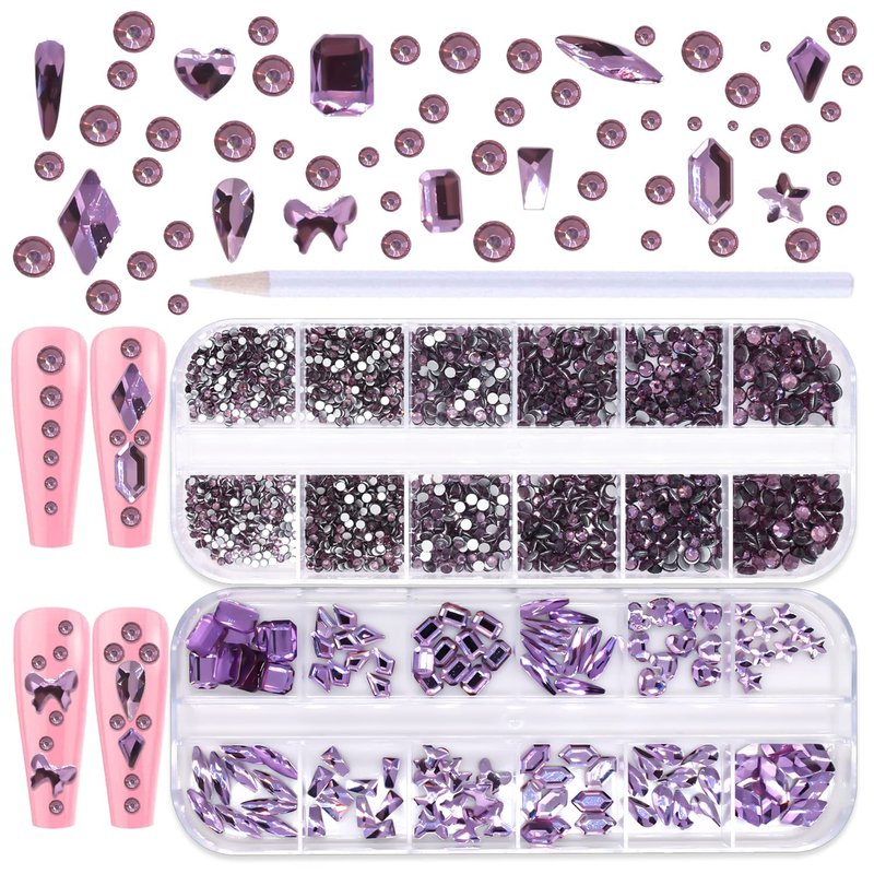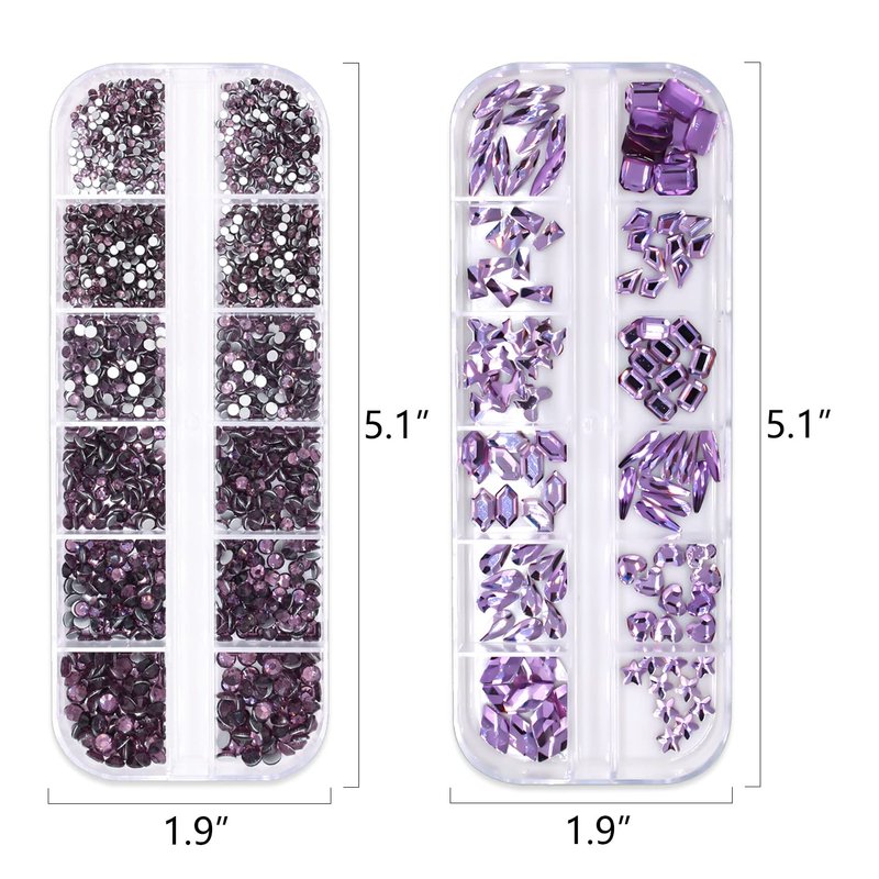 - 【Purple Nail Rhinestones And Crystals Set】It is glass purple nail rhinestones crystals set: each box is with 6 sizes round rhinestones and 6 shapes crystals, total 12 shapes crystals and 12 grids round rhinestones with 6 sizes