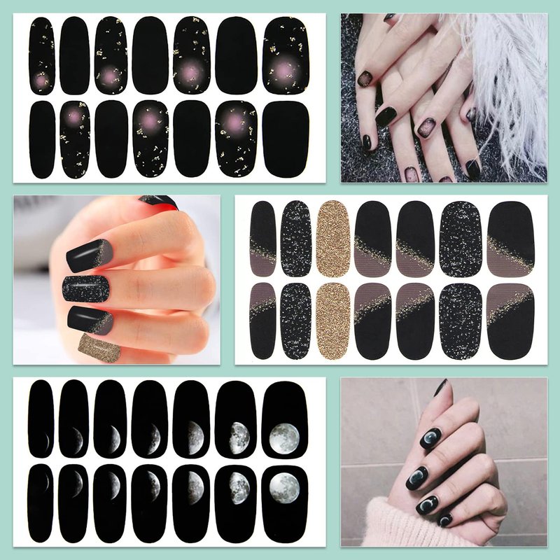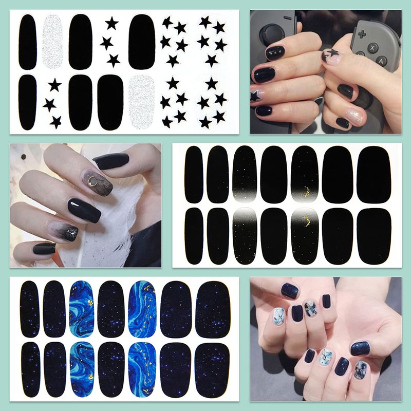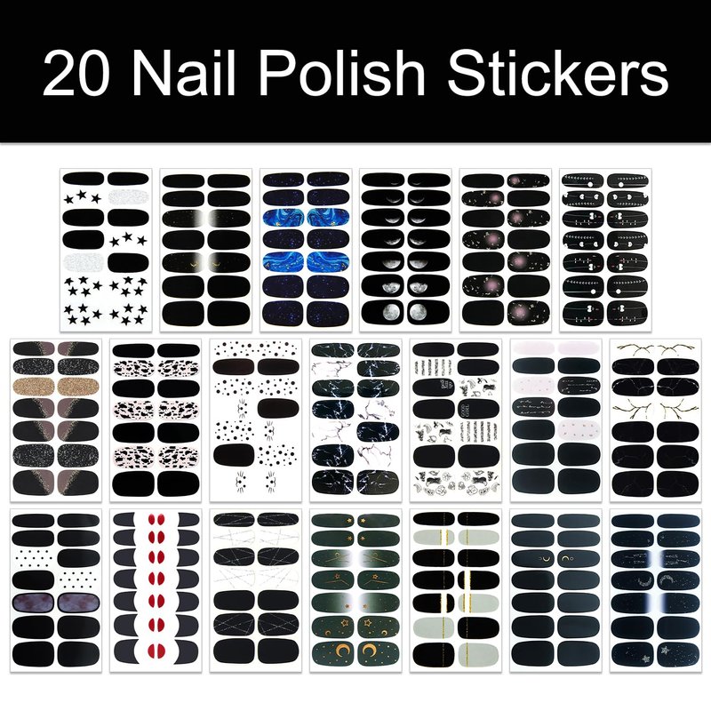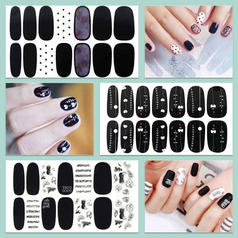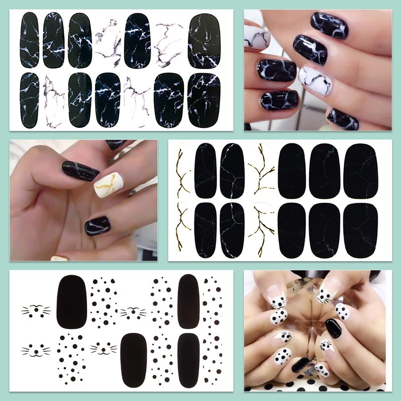 - 【20 DIFFERENT BLACK STYLE DESIGNS】: these full nail wraps including various different black punk style designs, heart, grids, lines, leafs,etc. that are fashionable to mix up with different style everyday, so it will make your nails more dazzling and charming.