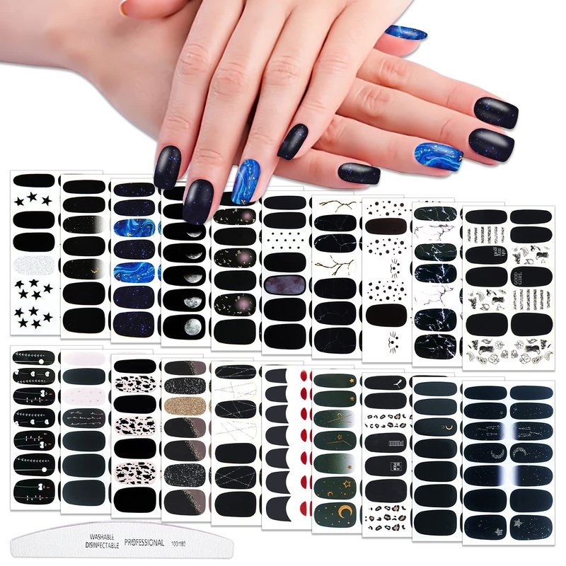 - 【PACKAGE CONTENTS】: 20 sheets black self-adhesive nail strips + 1pc moon shape nail file. 14 pieces for each sheet, 280 pieces in total. You can design unique nails art as you like.