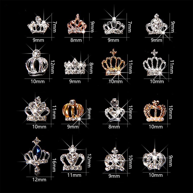 - 【3D Gold Crown Charms For Nails】: Package Content 32 Pcs alloy gold and silver crown nail charms with 16 different designs, 2 pcs for each design. Shinny and fit for plenty of nail art designs