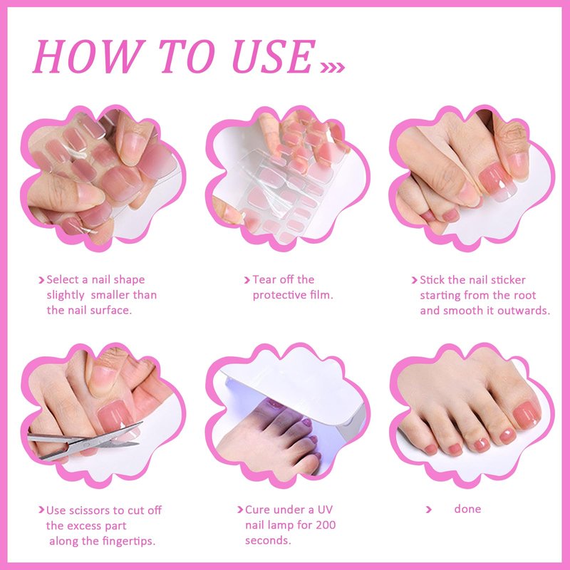 - SALON-QUALITY ELEGANCE - Crafted from premium gel, our semi-cured toenail strips are pre-cured to 60%, providing a flexible yet durable texture. After curing under a UV nail lamp for 120 - 180 seconds, enjoy salon-grade toenails that can last over 2 weeks.