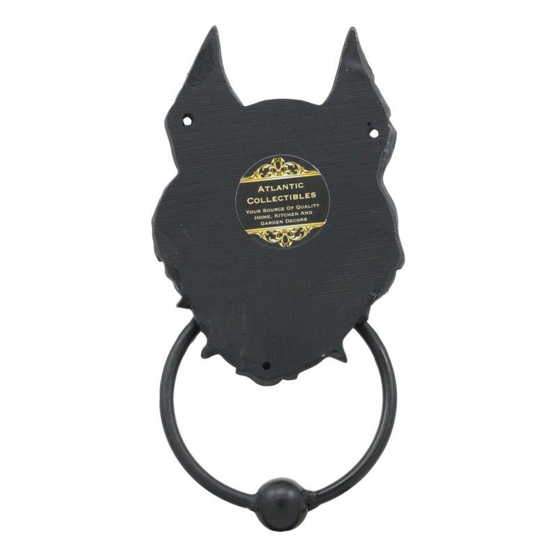 This Wolf Door Knocker measures 8.25" tall, 3.75" wide and 1.75" deep approximately. This Wolf Door Knocker is made of cold cast polyresin with a metal ball ring, hand painted and polished individually.