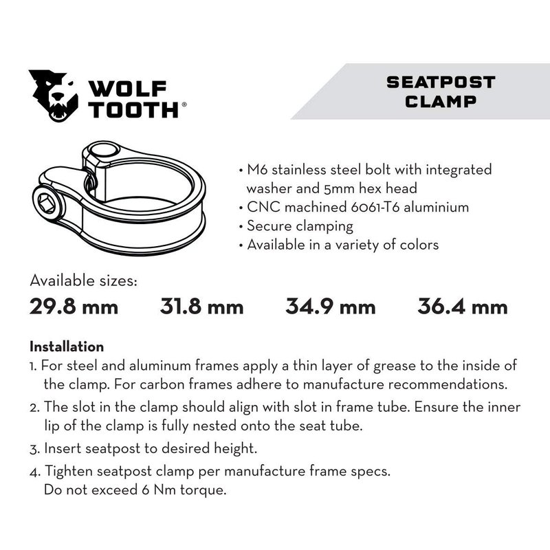 The precision-engineered Wolf Tooth Seatpost Clamp secures your seatpost and looks good doing it. At the heart of the Wolf Tooth Seatpost Clamp are our custom self-aligning bolt and anchor. The M5 bolt includes spherical washer and mates with a cylindrical anchor barrel. This means that threads are always perfectly aligned, preventing binding and ensuring consistent clamping force.