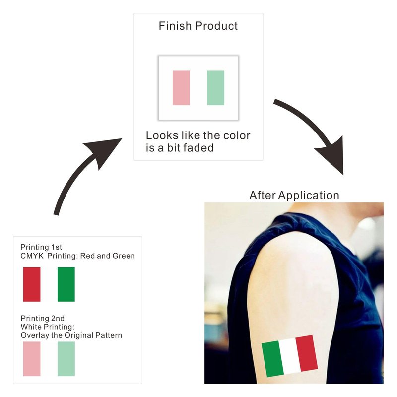 Womaha temporary flag tattoos Temporary flag tattoo is a water transfer process. As long as there is water, it is easy to use and remove In the World cup, European Cup, Asian Cup and other football matches, a large number of temporary flag tattoo appear. Fans use the marks of their country or favorite team on their faces, arms and foreheads, they were very excited to cheer for the team How to apply 1. Choose the pattern you like and cut it off, if necessary 2. Tear off the covering film to make the pattern fit the back of hand, if you want to use it here 3. Gently wipe the tattoo paper with a wet paper towel or water 4.10-15 seconds later, gently take out the paper and wait for the "tattoo" to dry Succeed! you will get a beautiful "tattoo" How to remove These temporary tattoos can be easily removed by baby oil. Or just wash it a few times with warm water Warm prompt 1. It is not suitable for children under 3 years old 2. If discomfort occurs, please stop using it 3. Don't use it near your eyes Sharing with first-time users Due to process requirements, all temporary tattoos in water transfer printing are flipped when applied to the printed pattern, and the pattern after application is correct. The two are mirror images. Regarding temporary flag tattoos: Most flag designs include white, such as the flags of the United States, Britain, and Japan. During production, a white print needs to be added to cover the entire pattern, which looks a bit blurry before use and distorts other colors. But it does not affect the use, as the color will become normal after application; Some flag designs do not have white, such as the flags of Germany and Colombia. When producing temporary tattoos for this type of flag, there is no need to print white and bright colors If you need to browse more, please enter the store, more products and more discoveries