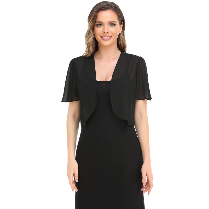 Women Black Bolero Shrug Soft Chiffon Open Front Sheer Short Sleeve Cropped Cardigans for Evening Dress(Black,M)