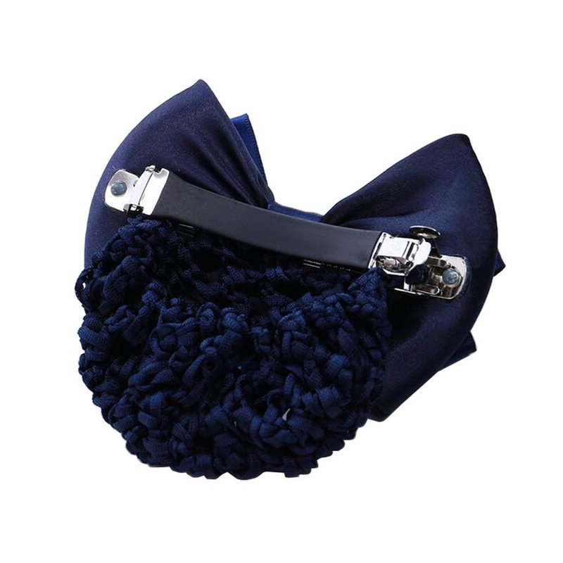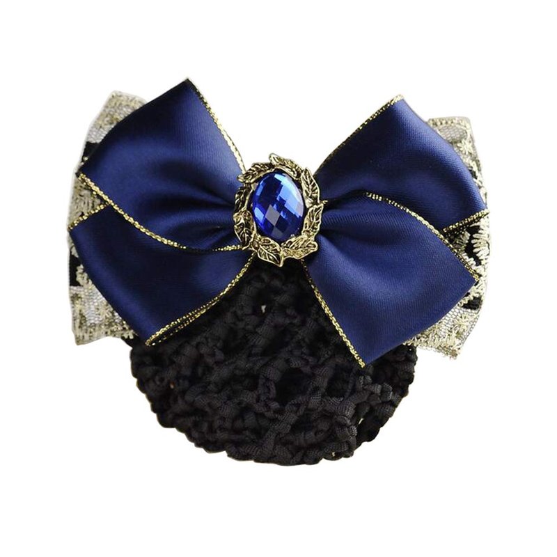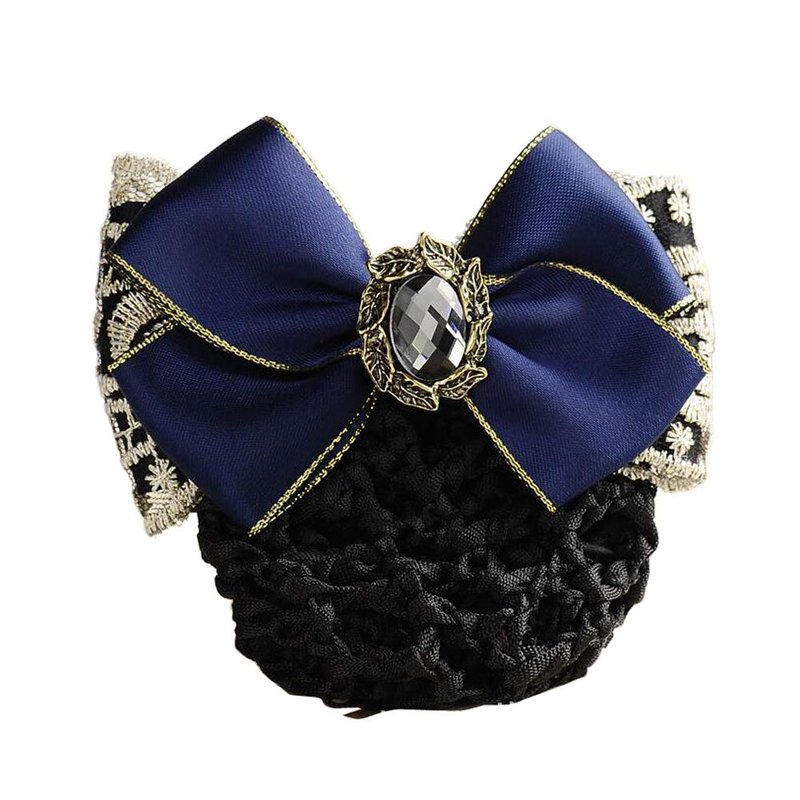 Women Lacrosse Flower Lace Ribbon Bowknot Rhinestone Snood Net Elastic Hair Clip Barrette Bun Maker Bow Cover Hairnet Decor for Nurse Bank Worker Air Hostess (Blue)
