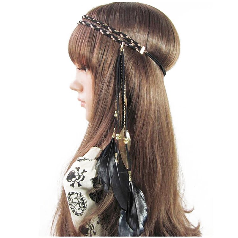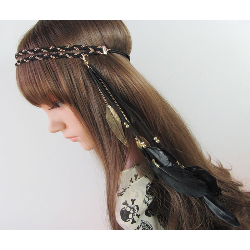 Women Lady Bohemian Double Braided Headband Tassels Hairband Headwear Hippie Feather Headband Hair Hoop Handmade Indian Fascinator Headband Headdress Hair Bands Hair Accessories (Black)