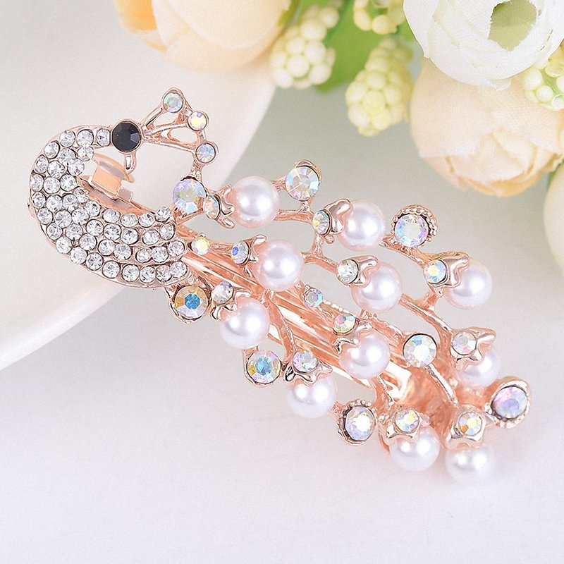 Womens Barrettes Women Girls Fashion Crystal Simulated Pearl Peacock Barrettes Hairpins Elegant Animal Hair Clips Gold-color