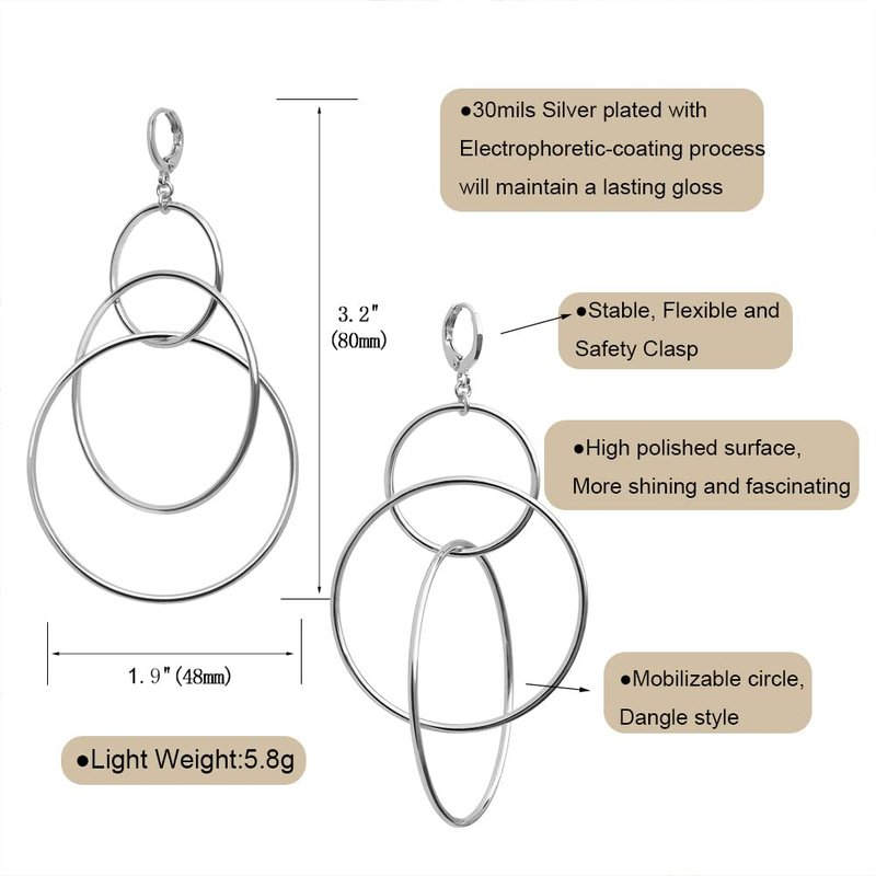 - 【Stylish & Elegant Design】This hoop dangly earrings comes with 3 serial Circle,The Lenth from top to bottom is about 80mm,The weight on each side is 5.8 grams,it is lightweight and comfortable to wear.Surely it is a very pretty dangling earrings for women and full of charming style,will catch people’s eye in a instant.