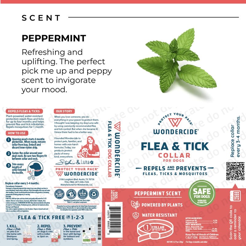This plant-powered flea and tick collar for dogs (up to 23” neck) four months or older offers a safe*, effective, convenient way to repel fleas, ticks, and mosquitoes – and prevent infestations for up to four months. USA made with U.S. and global components. *When used as directed. Only repels. Wondercide Flea & Tick Collar is an added layer of repellency against fleas, ticks, and mosquitoes. Use with Flea & Tick Pets + Home spray to protect your pet. Active issue? Use Flea & Tick spray on your pet and in home, and Flea & Tick Yard + Garden to kill pests in your yard. Sensitivities can occur with any product, even plant-powered. Check your pet's skin under the collar once every day for 3-4 days. Discontinue use if signs of sensitivity appear.