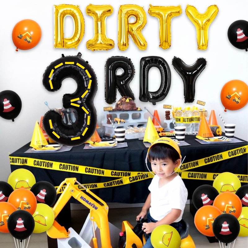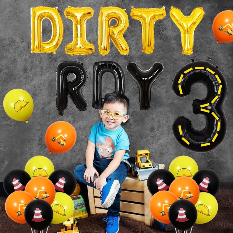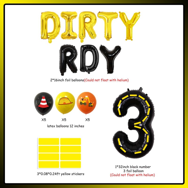 Accessories parameters : 15*12inch print latex balloons(5*yellow helmet construction car, 5*orange excavator construction car, 5*black barricade construction car) 1*32inch black number 3 foil balloon(Could not float with helium) 3*0.08*0.24ft yellow stickers 2*16inch foil balloons(1*golden DIRTY, 1*black rdy)(Could not float with helium)Warm Tips: