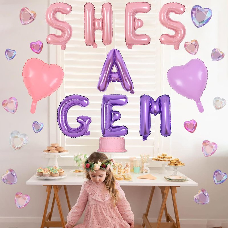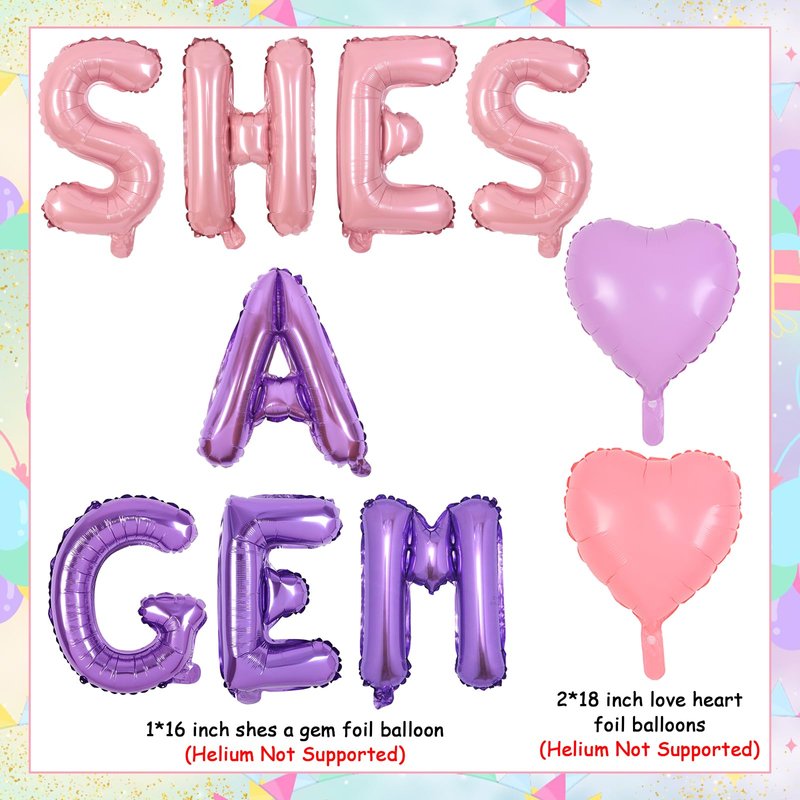 - Package include:You will get 1*16 inch shes a gem foil balloon. This she's a gem party set features a balloon banner in shimmering pink, purple, and jewel hues for an exquisite gemstone-themed celebration