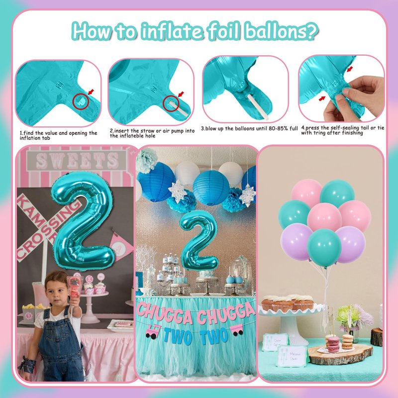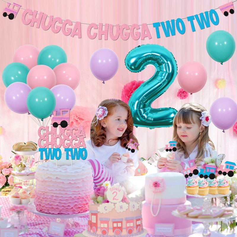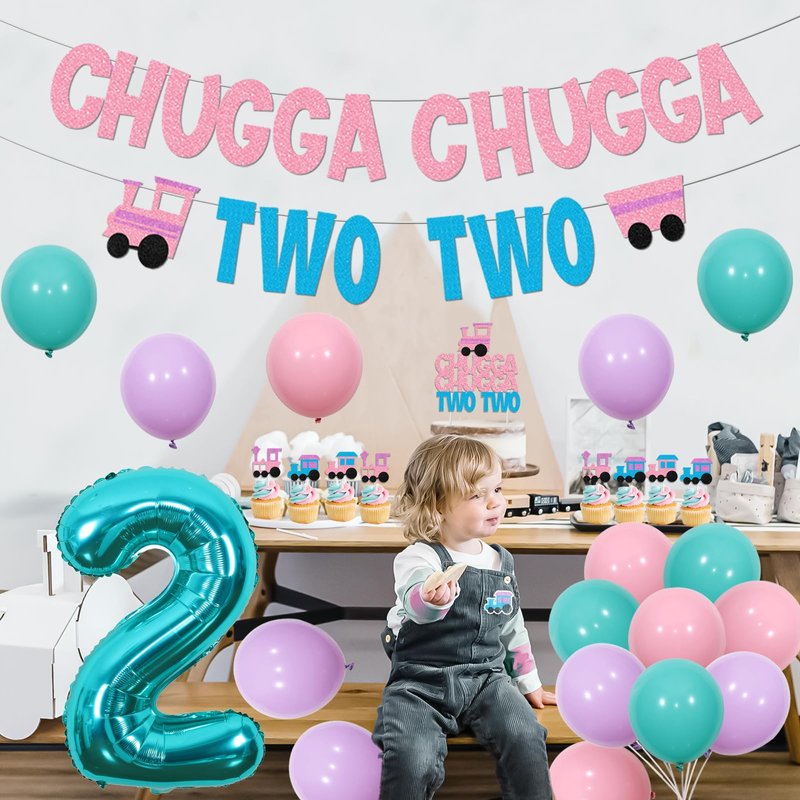 This product is specifically for female 2-year-old child's birthday set, powder blue m cake instoppers ert row is ideal for use as a photo prop./p> Accessories parameters : 6*12 inch soft pink (outside) with 12 inch pink (inside) latex balloon set 10*12 inch latex balloons (6*blue, 4*purple) 12*train chugga chugga two two cupcake toppers 1 * 13.5 * 14cm train chugga chugga two two birthday cake topper 1*train chugga chugga two two letter banner 1*32 inch blue number two foil balloon(Could not float with helium)