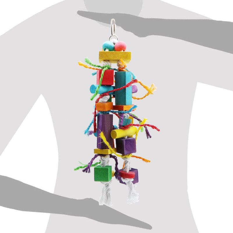This bird toys has lots of wood shapes, colors, and knots to keep your parrot entertained and challenged.