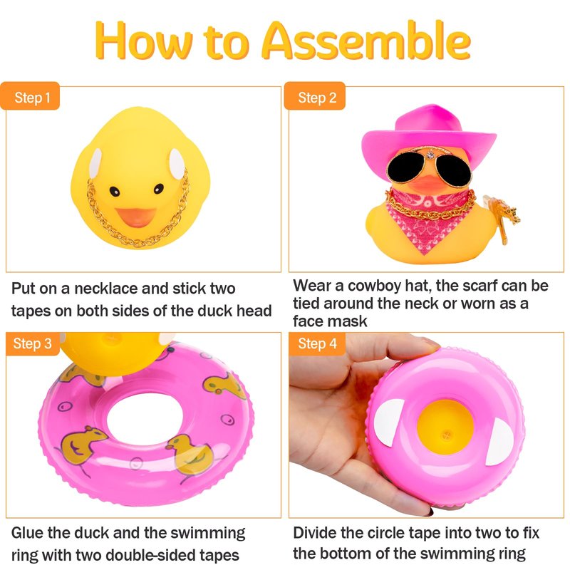 - DIY Western Car Accessories: Need to assemble, put on the scarf and fix the glasses with mini tape, put the hat on the duck's head, put the swimming ring at the bottom of the rubber duck car decoration, and then fix the cute duck car decoration with double-sided tape. If you have any questions, please feel free to contact us, and we will respond to you within 24 hours.