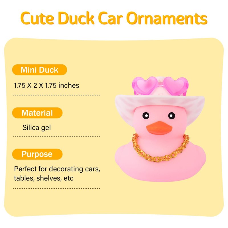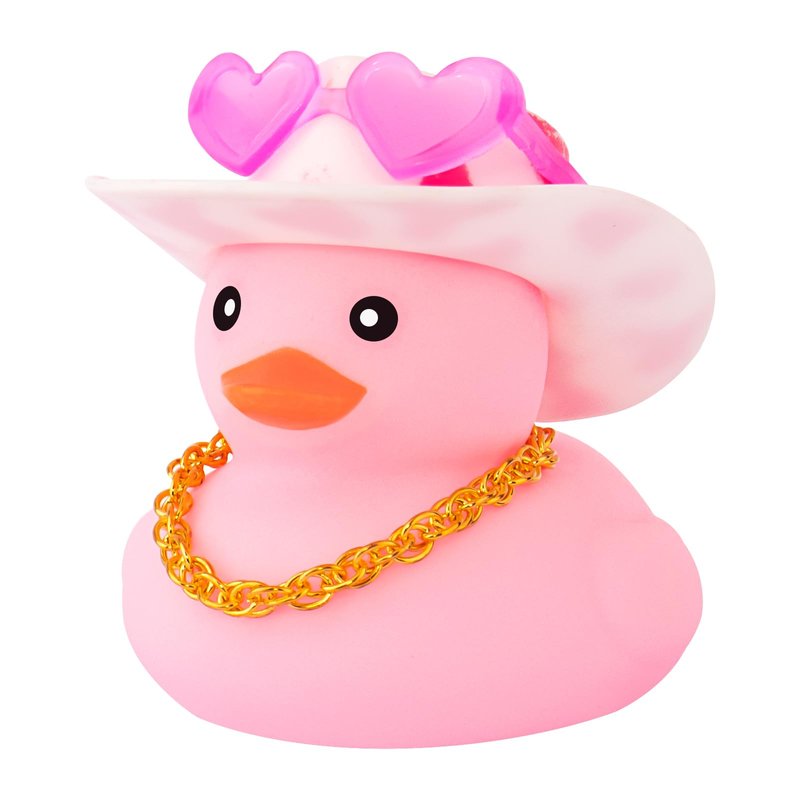 - Package: Includes 1pcs light pink rubber duck with a pink cowboy hat, a pink heart-shaped sunglasses, a gold chain as necklace, and double-sided tapes.