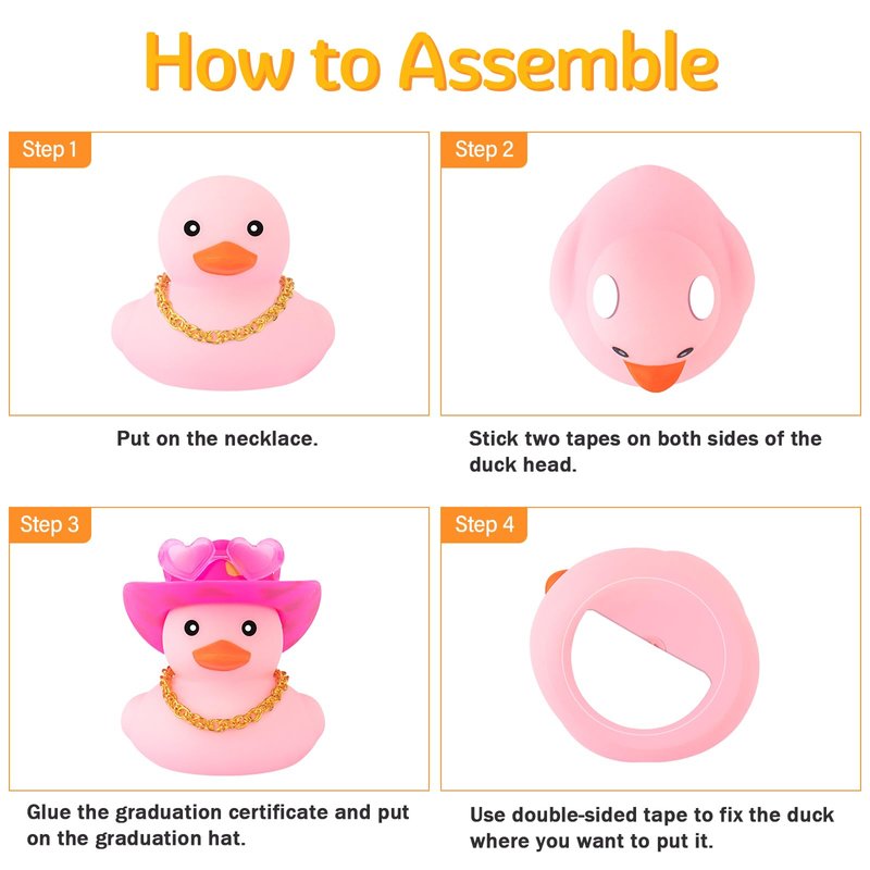 - Easy to DIY: These small duckies needs to be assembled but it can be easily DIY without 1 minute. You can first put the necklace and sunglasses on the duck, then use mini tape to secure the hat and use the small round adhensive to stick the duck to any place you want. What a cute princess!