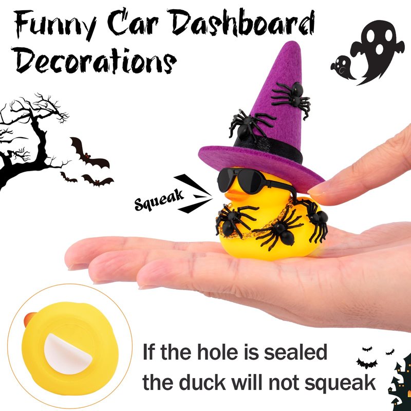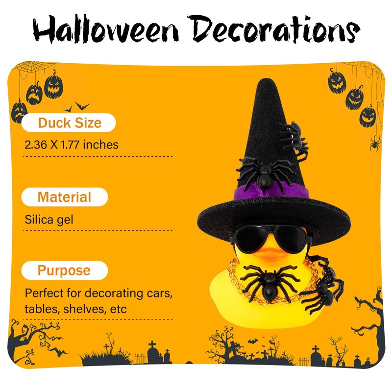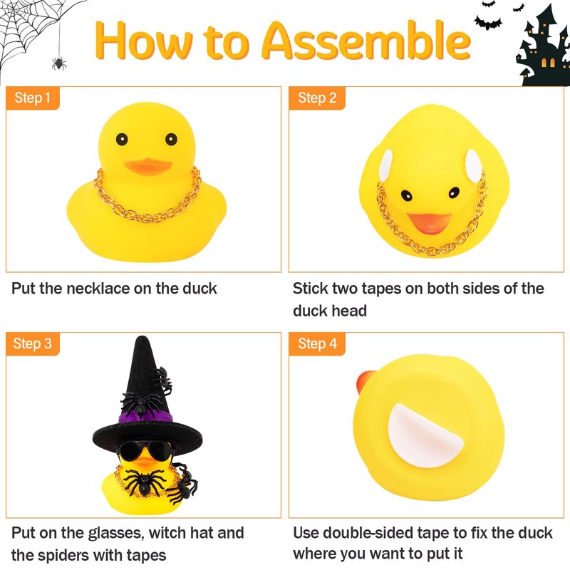 - Package Content: Comes with a rubber duck, a mini witch hat, a glasses, a chain, 5 spiders, and double-sided tapes