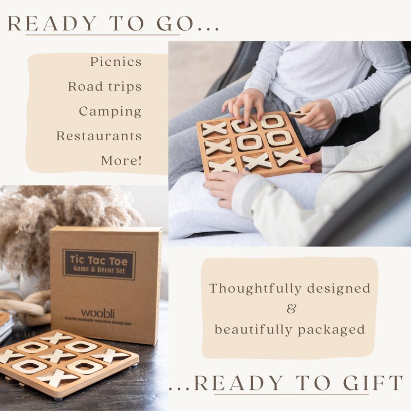 WOOBLI Tic Tac Toe Indoor/Outdoor Game: Our tic tac toe game is the epitome of classic gaming reimagined with a touch of boho elegance. These versatile board games for family night with kids transcends traditional board gaming, offering a dual-play design that can be enjoyed either flat for a timeless experience or upright with a built-in photo stand. Impress your guests by adding a distinctive flair to your coffee table games. Crafted from premium Basswood, our wood tic tac toe game not only ensures durability but also brings a natural aesthetic to your gaming sessions. This 8.63 inches X 8.63 inches tic tac toe game isn't just a game; it's a chic decor piece that effortlessly blends boho and natural styles. Elevate your home or coffee table with its timeless design, making your tic tac toe decor a conversation starter and a captivating centerpiece for any room. Designed for more than just ordinary gameplay, the tic tac toe boasts portability as a key feature. Its lightweight construction allows you to carry the game with ease, transforming any location into a potential gaming area. Taking this game board table outdoors is a breeze. Its compact design makes it an ideal wooden games for family for picnics, park outings, or beach days, turning any outdoor space into a hub of interactive fun. The silicone corners provide stability for flat play, ensuring a secure surface even in the midst of your outdoor adventures. About Us: WOOBLI is a small, family-owned business. We love designing convenient and thoughtful products that you can use in your daily life. This wooden tic tac toe game and decor set is an effort to do just that. We hope you love our wood games for adults and family as much as we do. Thanks for supporting our family business.