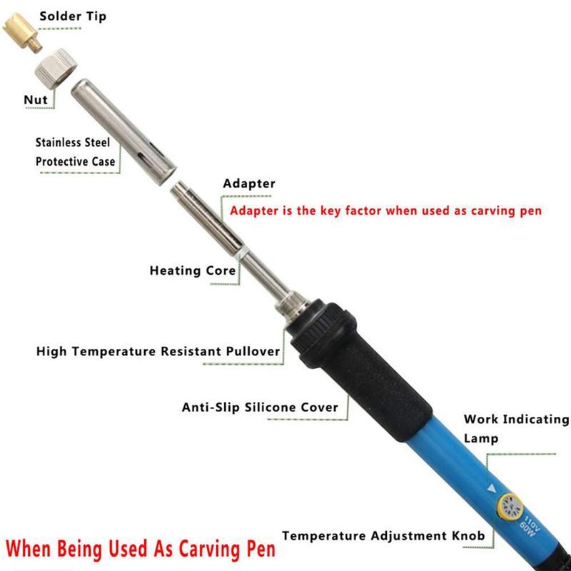 - WOOD BURNING KIT: The pyrography pen is adjustable temperature. Comes with lots of different tips and stuff, meets the needs of any small project