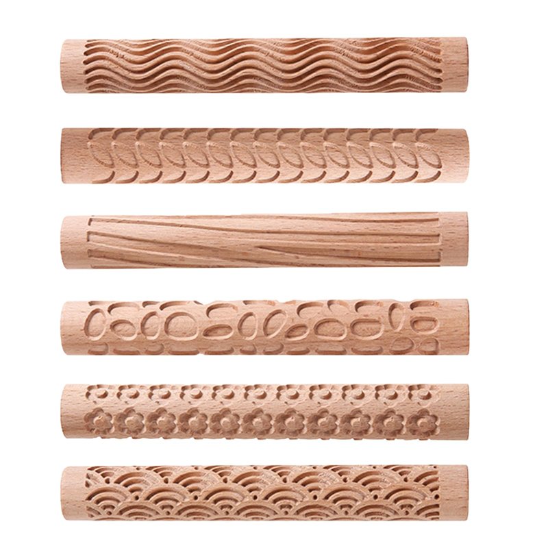 6 Pcs Wood Clay Pattern Roller Textured Rolling Pin Clay Modeling Pattern Rollers, 5.9inch Wooden Handle Clay Texture Slab Roller Clay Pottery Rolling Pottery Tools for Ceramic
