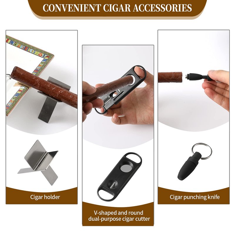 - ABUNDANT CIGAR ACCESSORIES, 1cigar Cutter,1cigar Stand, 1 Cigar Puncher mobile And Great For Travel With A String Handle Attached For When You’re On The Go.Travel cigar humidor comes with Spanish cedar paper to add fragrance.