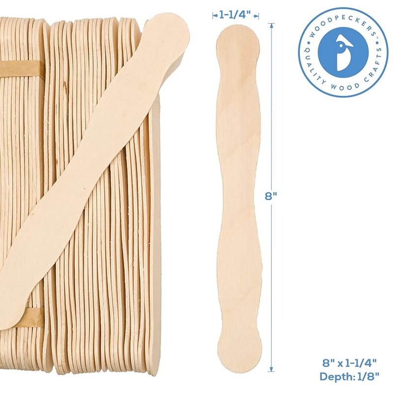 - BULK BUY - Sold as a pack of 100 sticks. Measurements are 8 inches long by 3/4 inches wide. Its natural wood color goes well with any theme or occasion. From fancy party favors to fake flowers, it makes any art project come out looking fantastic!
