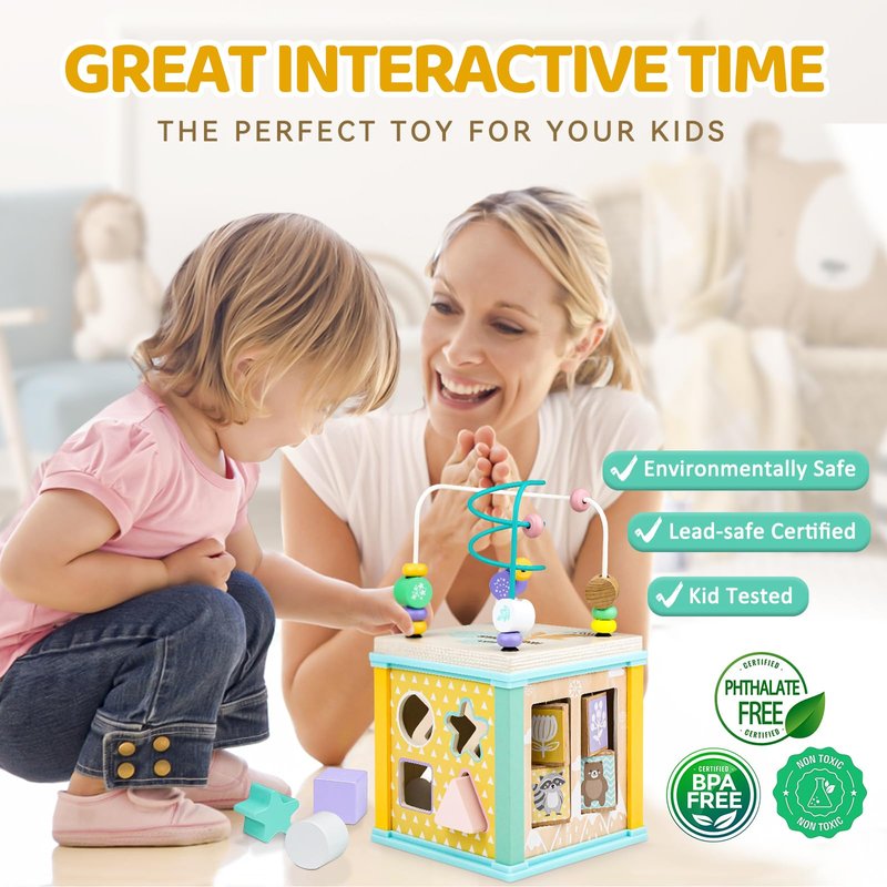 - Versatile Educational Toy: This wooden activity cube offers five exciting games in one, including a bead maze, rotating matching puzzle, shape sorter, spinning gears, and zigzag block race. Designed to develop toddlers' hand-eye coordination, color and shape cognition, and fine motor skills, this montessori toys is perfect for 1 year old boys and girls