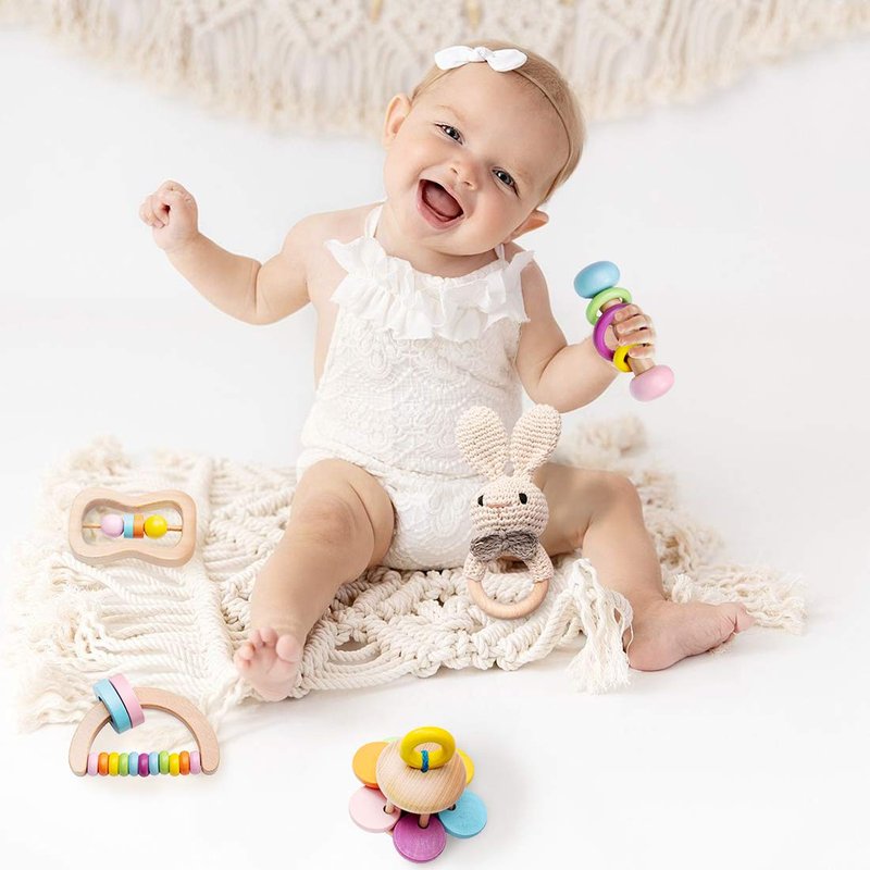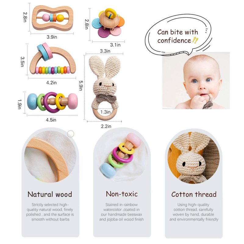 - MONTESSORI RATTLE PLAY KIT: 5PCS baby rattle toys includes a rabbit crochet rattle and 4 different shapes of rainbow wooden rattles. Various shapes, bright colors and rich sounds help stimulate the baby's visual and auditory development and exercise the baby's grasping ability. The colorful gift box ideal as first baby sensory toys and gifts for newborns.